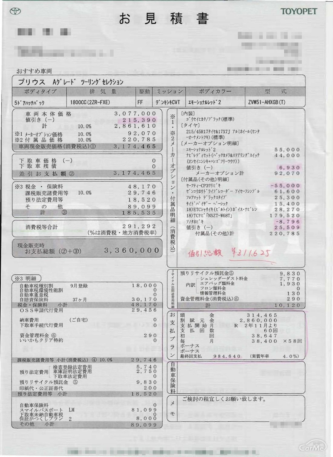 今が買い時 トヨタ 4代目プリウスは支払い総額336万 実際に見積もりを取ってみた